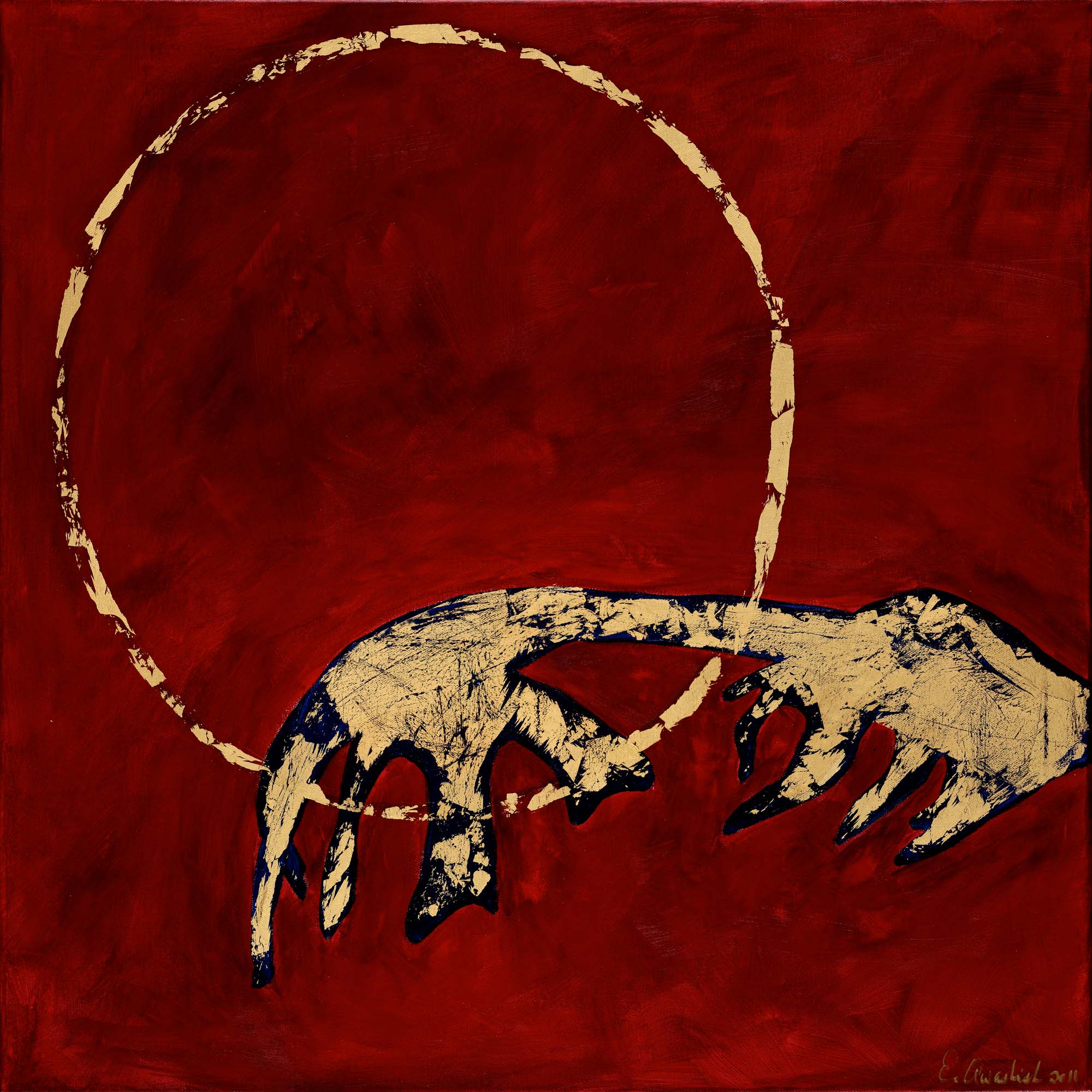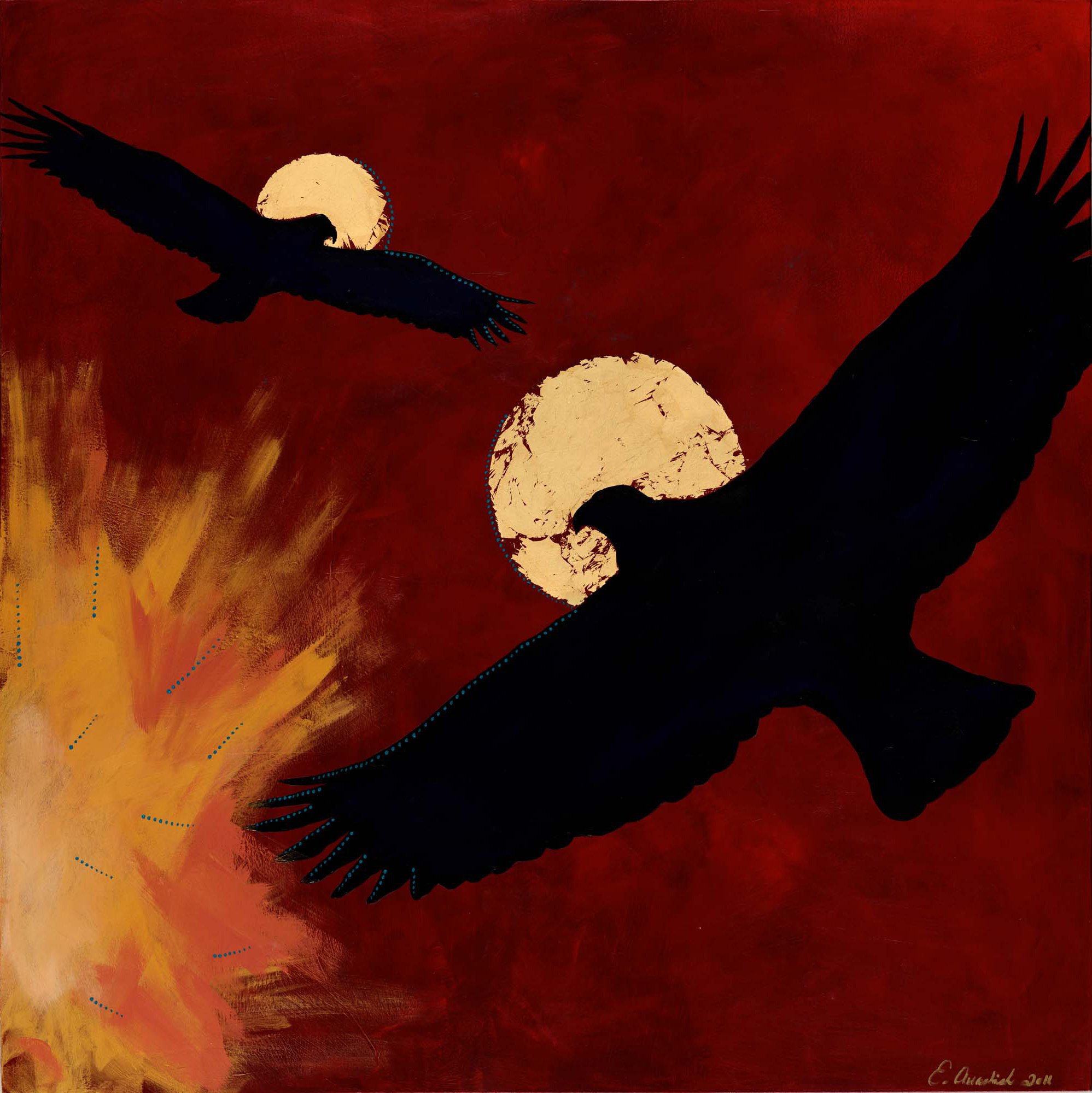 Her work is marked by spirituality, symbols and syncretism. Eruoma likes to mix symbols referring to the First Nations culture and the Catholic religion. Through this interweaving of symbols, her works speak of both contrast and mixing, duality and balance, suffering and serenity. They are a reflection and a questioning on the phenomena of hybridization in the First Nations culture.