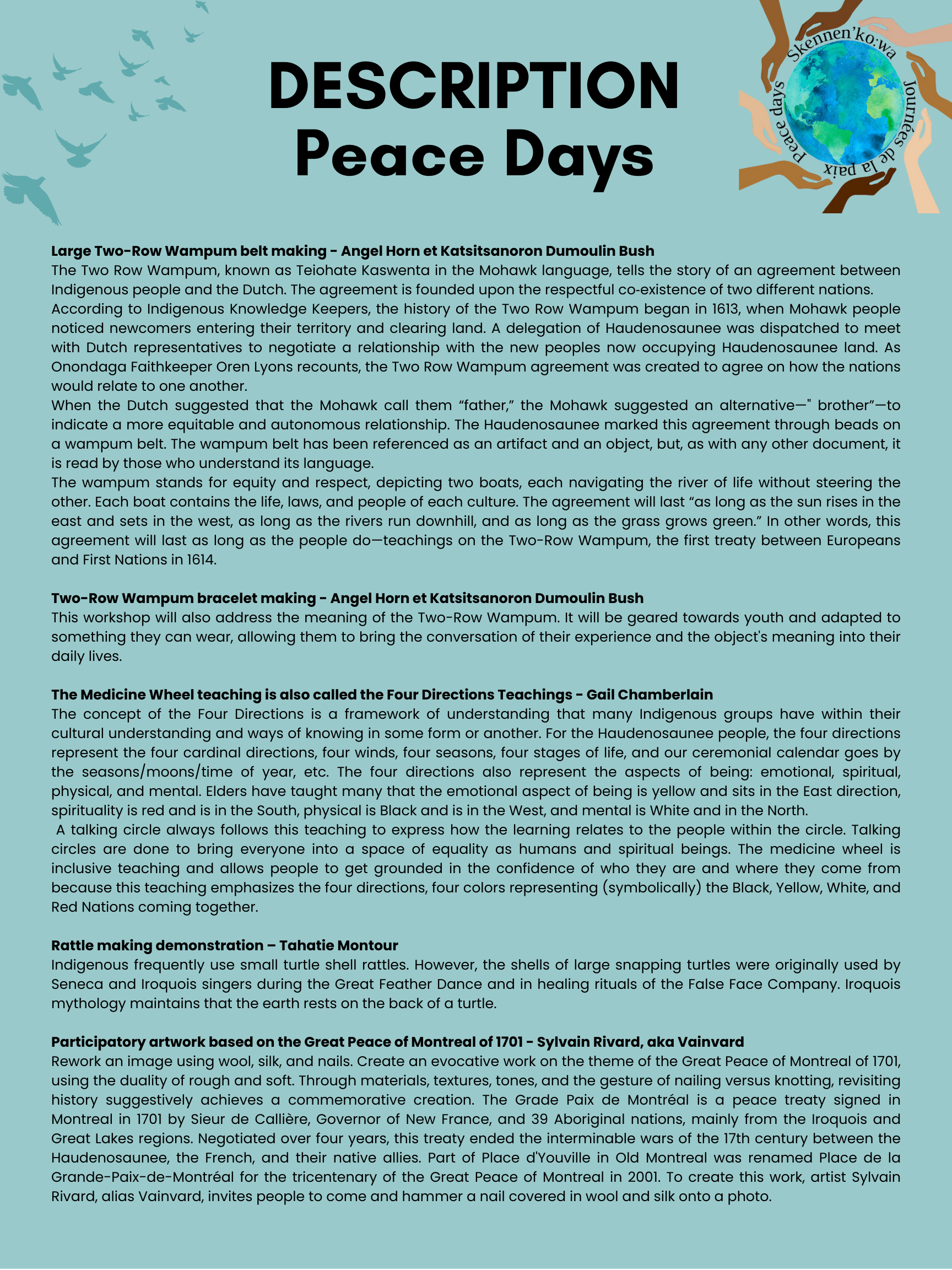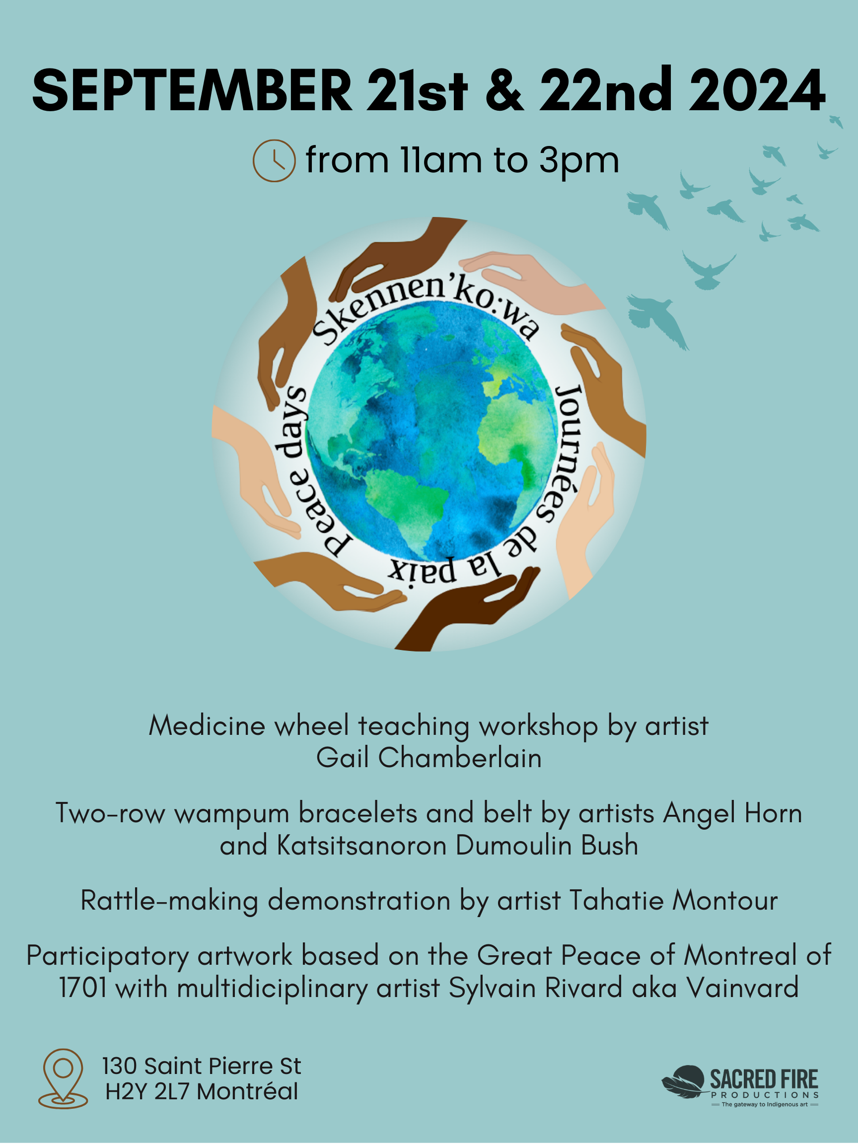 Join Sacred Fire Productions to honour peace, the land and the teachings of Indigenous culture. Together, let’s create a space for sharing with various workshops within our cultural space. Scroll through the images to learn more and to see the program for this beautiful weekend!